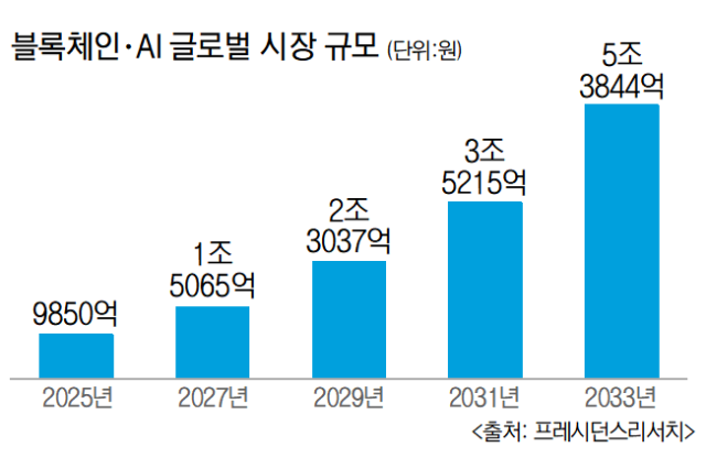 글로벌 시장조사 업체 프레시던스리서치는 올해 글로벌 블록체인·AI 시장 규모가 6억 8000만 달러(약 9850억 원)에 이르는 것으로 추산했다. 2033년에는 무려 37억 1800만 달러(약 5조 3844억 원) 규모로 성장할 것이라는 전망도 내놨다. 프레시던스리서치는 "블록체인·AI 시장은 2024년부터 2033년까지 매년 평균적으로 22.93% 성장할 것이다"고 전망했다.