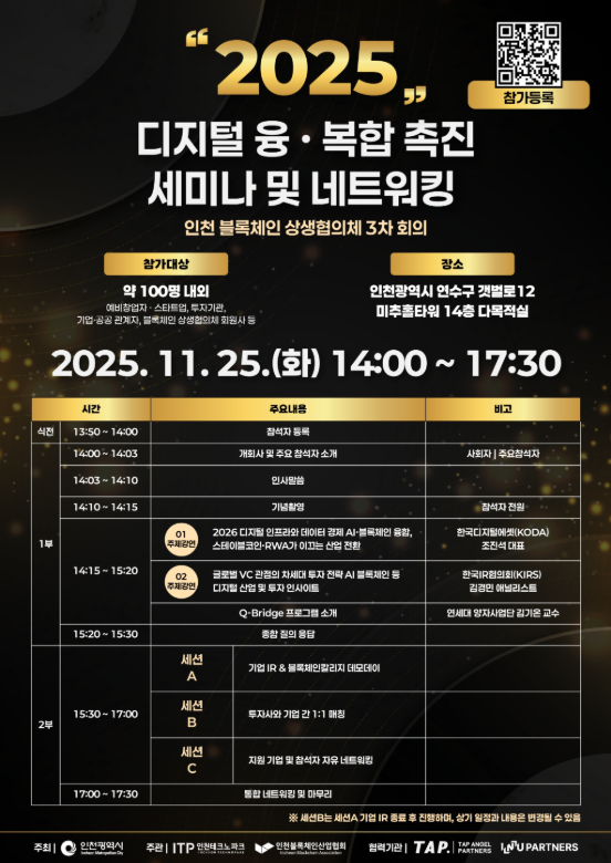 행사 핵심은 ‘블록체인 중심의 디지털 융합’이다. 협회는 올해 기술혁신 지원, 역량 개발, 네트워크 구축 등 다양한 활동을 통해 인천 기업들이 블록체인 기반 사업 모델과 투자 기회로 진입할 수 있는 토대를 마련해 왔다. 이번 세미나 역시 그 연장선상에서 기획됐다.
