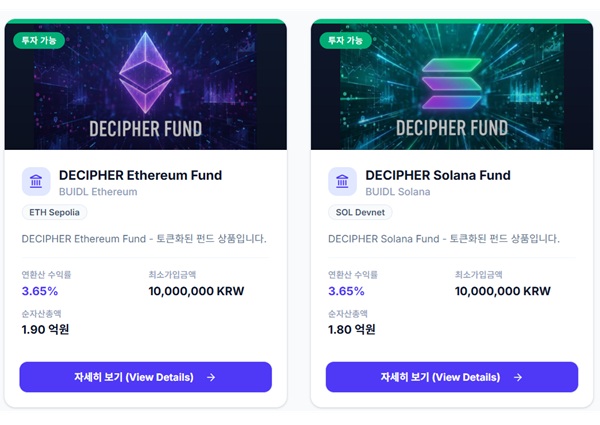 이날 신 학회원은 토큰화된 펀드 ‘디사이퍼 이더리움’과 ‘디사이퍼 솔라나’ 개념검증(PoC)을 진행했다고 밝혔다. 해당 상품은 MMF를 추종하는 펀드로 연간 3.65% 수익률을 제공하는 구조다.