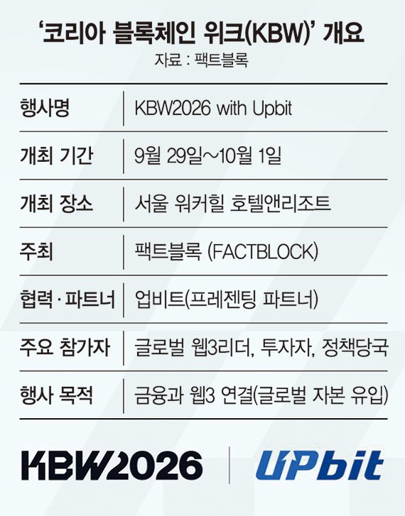 웹3 에코시스템 빌더 팩트블록은 'KBW2026 위드 업비트(KBW2026 with Upbit)'가 오는 9월 29일부터 10월 1일까지 사흘간 서울 워커힐 호텔앤리조트에서 개최된다고 15일 밝혔다. 이번 행사에서 업비트는 최상위 등급인 '프레젠팅 파트너'로 참여해 행사 전반에 걸쳐 협력을 확대한다.